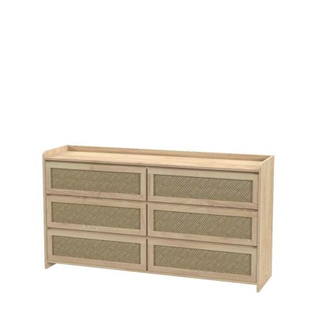 Commode en rotin. Façades en rotin clair. Cadre en bois assemblé. Longueur 77,6 cm, façade 23 cm. Les 6 tiroirs sont de même taille. Le panneau supérieur est chanfreiné à 45 degrés. L'ouverture s'effectue facilement avec les doigts. L'assemblage en KD est pratique et rapide. Le panneau supérieur présente un espace de 4,1 cm. Les angles sont arrondis des deux côtés. La commode est plus arrondie. Une tablette inférieure de 5 cm de hauteur est intégrée. Barre centrale. Pratique pour ranger les chaussures d'intérieur, elle réduit également les risques de se cogner les orteils. Une commode au design plus humain et épuré. N'hésitez pas à nous contacter.