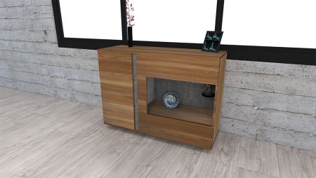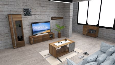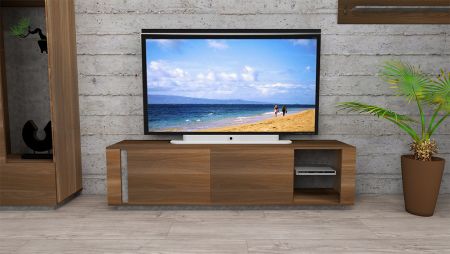 Dulap TV de dimensiuni mari, de 1800 mm, care poate găzdui televizoare LCD de peste 60 de inci. Două spații de depozitare cu uși și un spațiu deschis cu două straturi pe partea dreaptă, cu panouri de sticlă la mijloc. Amplasați aparate electrice multimedia pentru a evidenția mai bine caracteristicile modelului.