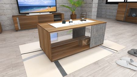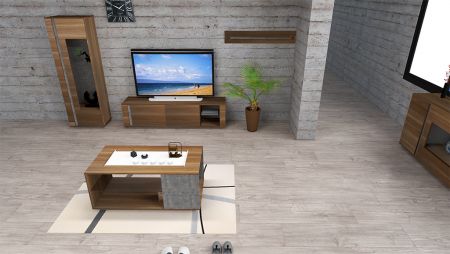 SlicethinnerColecția de mobilier pentru living este perfectă pentru cunoscătorii stilurilor ecologice de interior. Tonul cald al lemnului și efectul de piatră închisă vor face camera mai confortabilă și mai „caldă”.